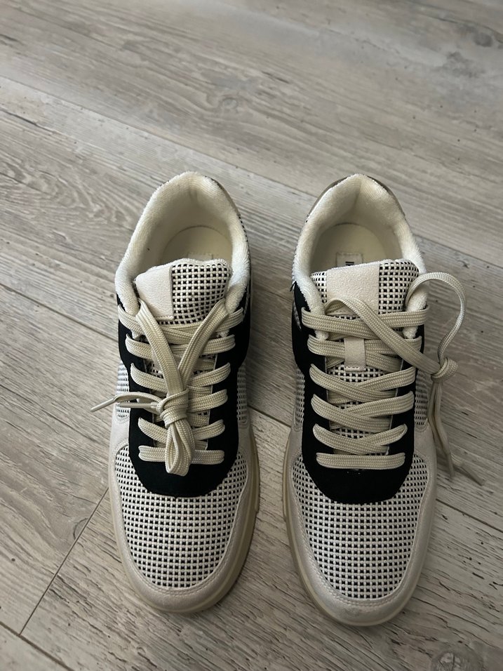 Ekoseli desene sahip, blok topuklu ve bağcıklı beyaz ve gri tonlarda kauçuk malzemeden yapılmış kadın spor ayakkabısı. Rahat sokak stili için uygundur.