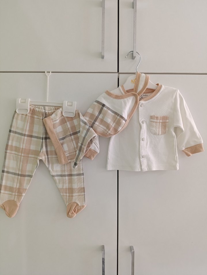 Pamuklu, ekru renk düğmeli uzun kollu , küçük ekoseli cep ve yakaya sahip. Hafif ekoseli pantolon önlüklü ve şapkalı tamamlanmış dört parçalı bebek takımı. Hastane Çıkışı Seti bir kaç kez kullanıldı