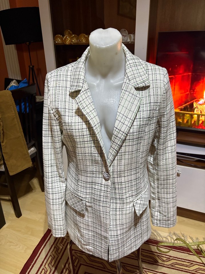 42 beden Ekoseli desende, düğmeli ön kapamalı beyaz mini blazer. Uzun kollu, regular fit kesim, ofis ve günlük sokak stili için uygun. Sentetik kumaştan üretilmiştir.