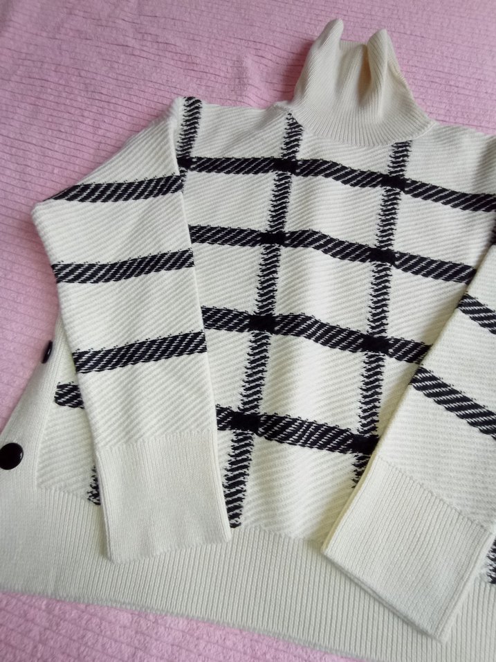 Ekoseli desende, boğazlı ve uzun kollu örme kadın kazak. Rahat kesimi ve normal boyuyla günlük rahat sokak stili için uygun beyaz ve gri tonlarda.