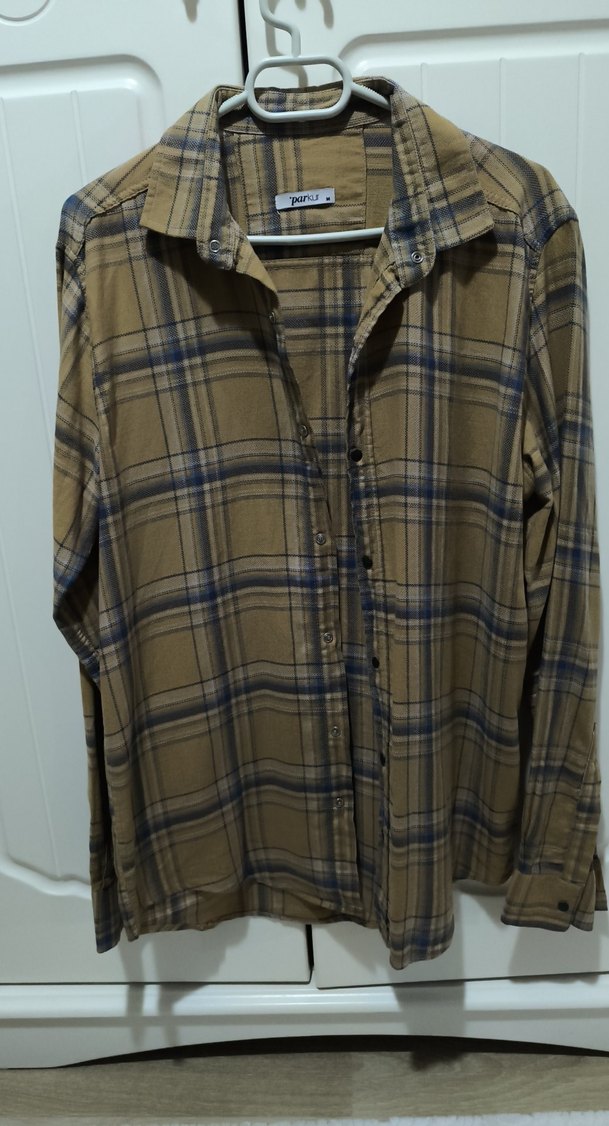 Parkur marka m beden ekoseli gömlek. Taba rengi üzerine mavi ve lacivert detaylı. Dar kalıp olduğu için s bedene daha uyumlu. 4 5 saat giyildi. Sıfır gibi diyebilirim. Fiyatta yardımcı olacağım.