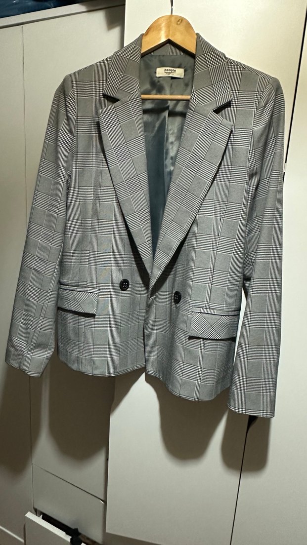 Ekoseli gri blazer, kesik yaka ve düğmeli ön detaylıdır. Uzun kollu, normal kesim ve midi boydadır. Ofis için uygundur.