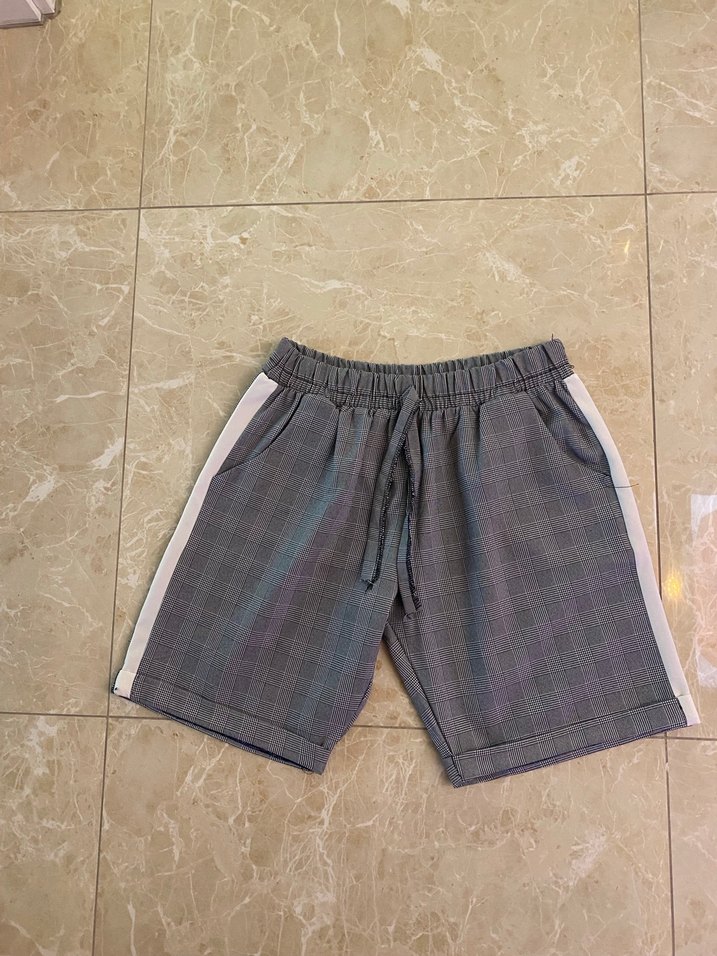 Gri ekoseli desenli, kemerli ve bol kesim mini şort. Pamuklu yumuşak kumaştan, yan şerit detaylı, günlük kullanıma uygun.