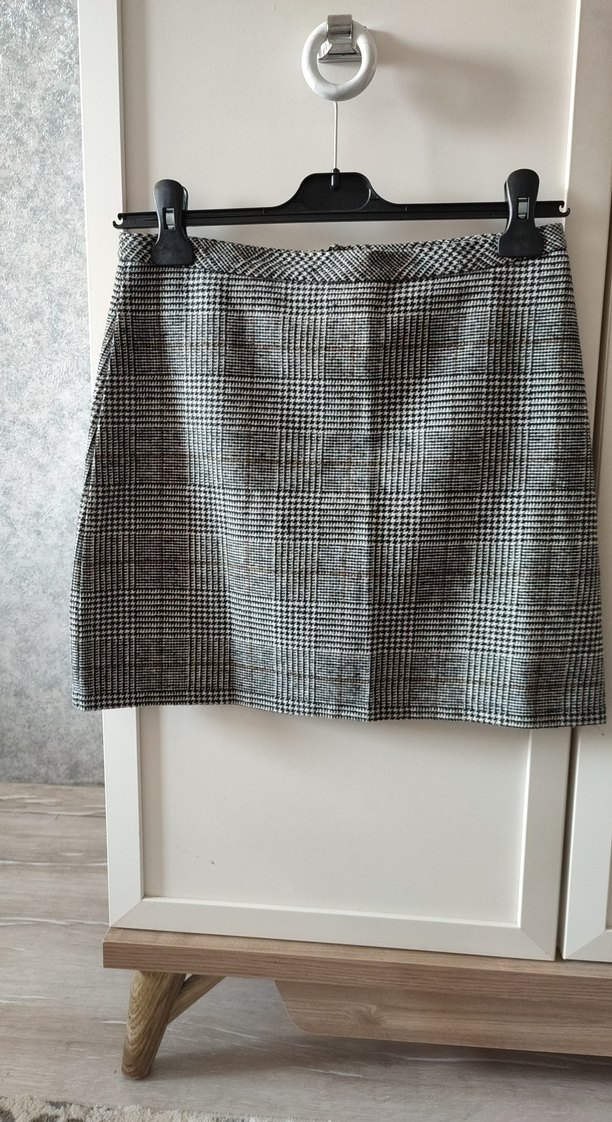 Gri ekoseli midi mini etek, kemerli ve regular fit kesime sahip, ofis ve günlük sokak stiline uygundur. bel 37 boy 41