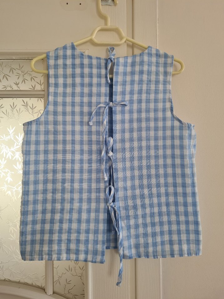 Yumuşak ketenden yapılmış, bol kesim, kadin gomlek . Yuvarlak yakalı, arka düğmeli bağcık detaylı, pastel mavi kareli desende. Bohem tarzda.