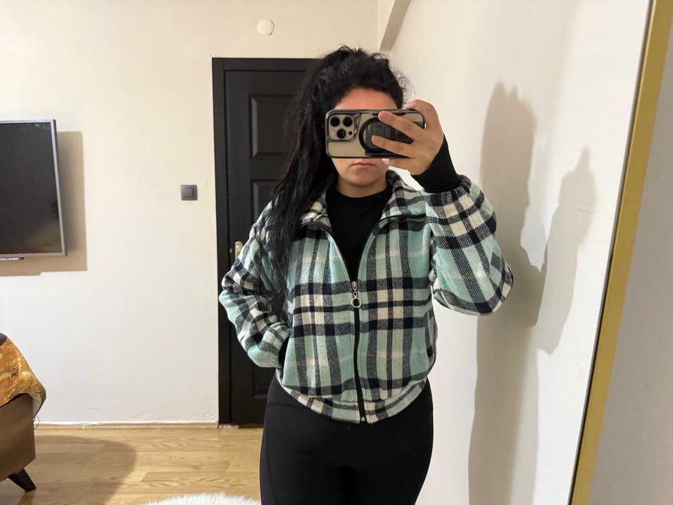 ekoseli, düğmeli ve yakalı kadın polar ceket. Rahat kesim, uzun kollu ve günlük kullanıma uygun.