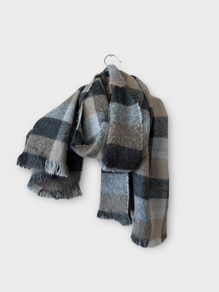 Gri tonlarında kare desenli, kadın yün şal. Sıcak tutar ve rahat, modern bir tarz sunar. Hafif tüylenme var ancak kullanıma engel değildir Eni 61 cm uzunluk Püsküller hariç 168 cm Şal ve atkı olarak kullanılabilir.