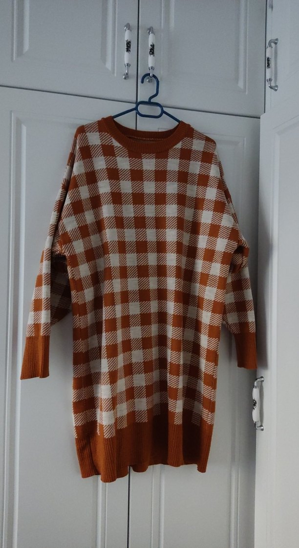 Ekoseli kahverengi örgü midi kazak, uzun kollu ve yuvarlak yakalı, rahat kesimiyle günlük sokak stiline uygundur.