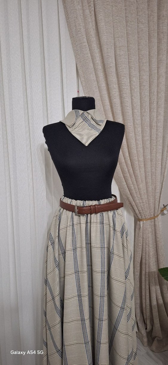 Bej-gri tonlarda, ekoseli Kilos etek istenilen beden ve boyda kişiye özel dikim yapılır
