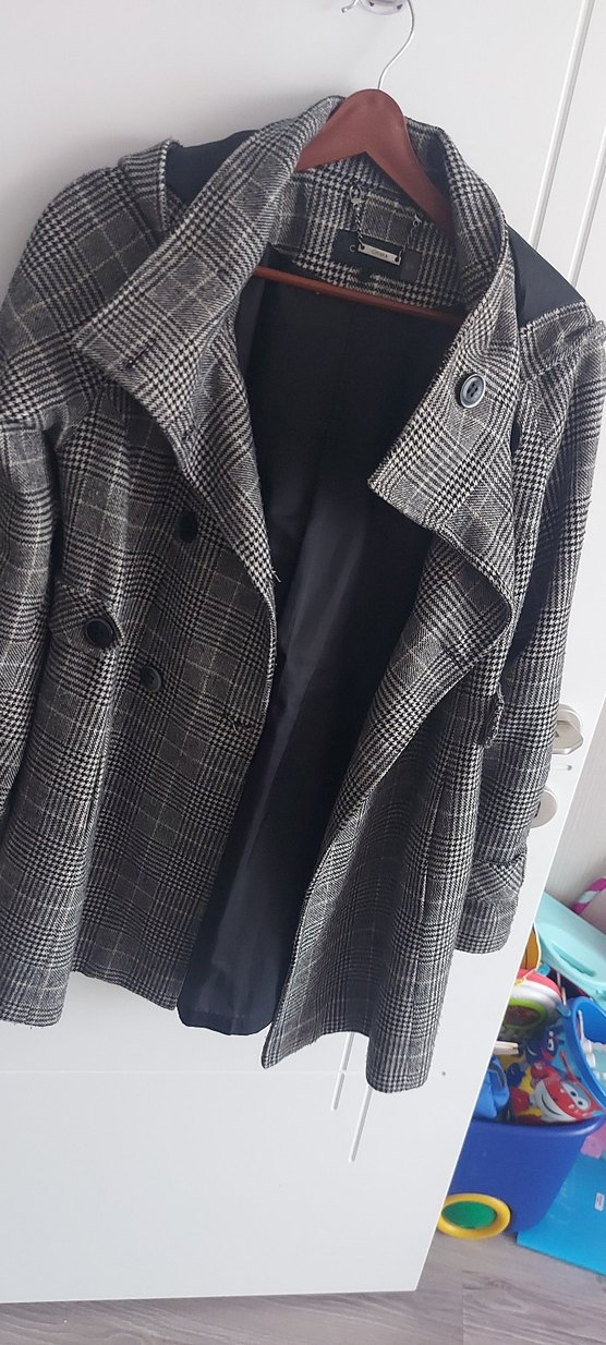 Ekoseli desende, çift düğmeli ve yaka detaylı klasik kaban. İç kısmı koyu renk astarlıdır.