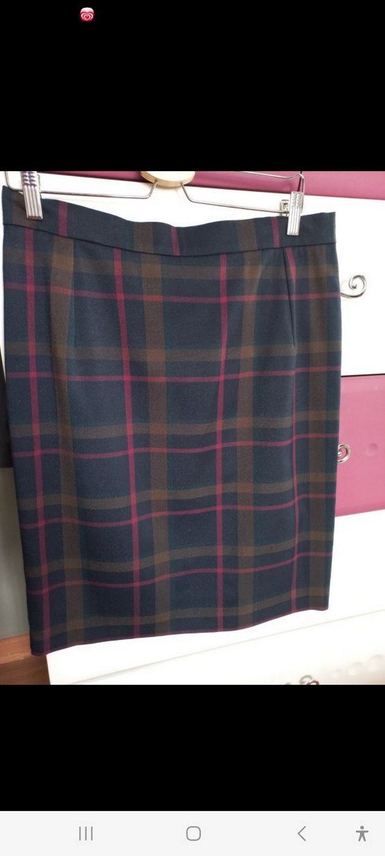 koyu renkli çok renkli ekoseli midi eteği. Sentetik kumaştan yapılmış, ofis ve sokak stili için uygundur.