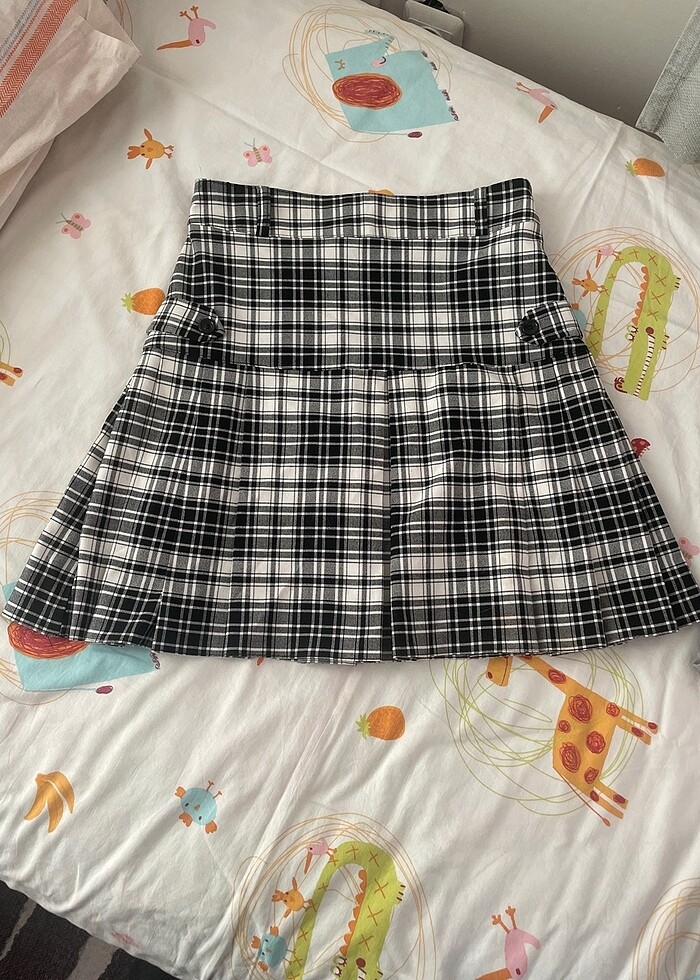 Düz üstü . Kareli, siyah beyaz renklerinde .kullanışlı kısa etek. Ölçüler fotoğrafta ekli. Yan kısımlardan daraltma yapıldı ve payı hala duruyor. Dileyen açıp daha büyük bedenle de kullanabilir . Beden M yazıyor ama s uyumlu