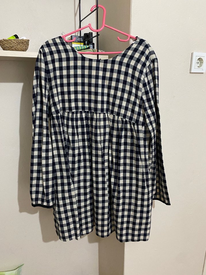 Pamuklu, uzun kollu, bol kesim hamile bluzu. Tekne yaka ve pileli tasarıma sahip, koyu ekoseli desende, günlük kullanıma uygun.