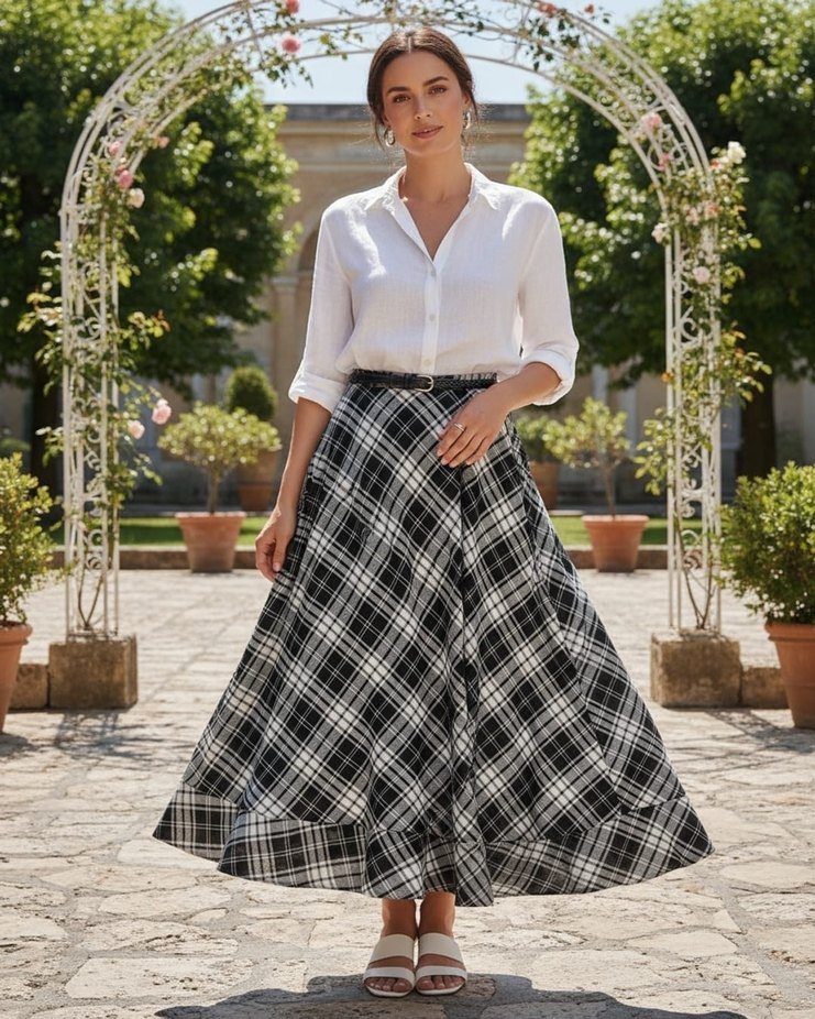 Pamuklu, ekoseli ve piliseli detaylara sahip bu uzun, bol kesim etek Paris tarzını yansıtır ve günlük kullanıma uygundur.