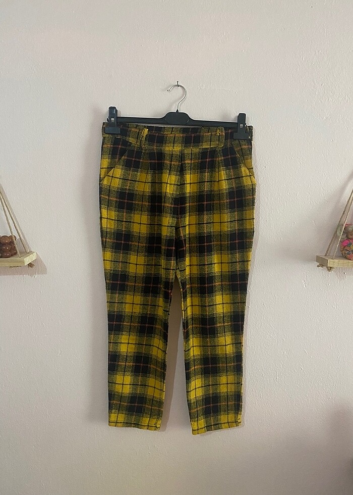 sarı ekoseli kışlık pantolon, yandan fermuarlı