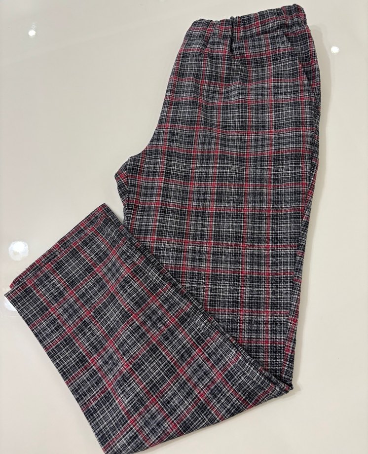 Ekoseli desene sahip, rahat kesim pantolon. Beli lastiklidir. S-M-L uyumludur.