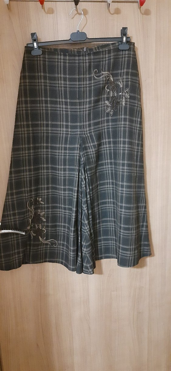 Sentetik kumaştan gri uzun pilili kadın eteği, nakış detaylı ve bol kesimdir. Ofis için uygun, gotik ve Paris tarzı izler taşır.