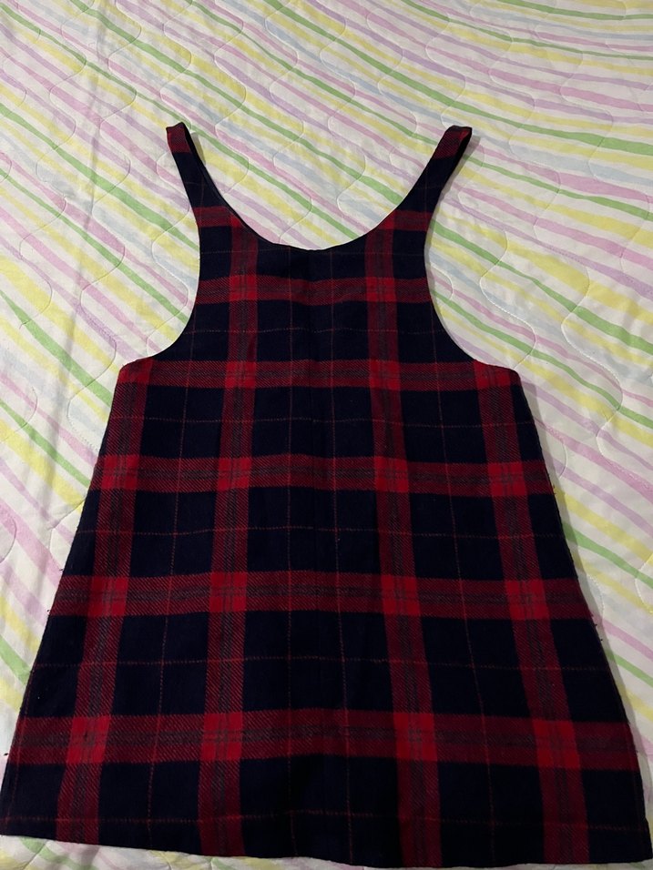 Kırmızı ve siyah tonlarda kare desenli koyu renk salopet
