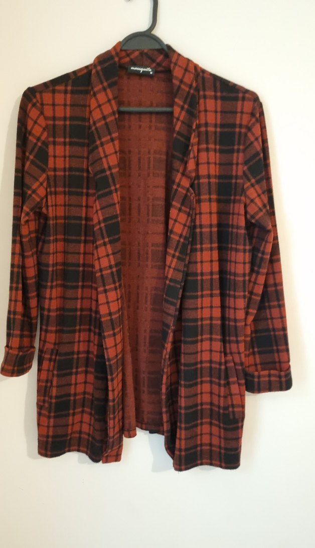 Uzun kollu,kolu katlı, triko kumaştan yapılmış, kırmızı siyah ekoseli, rahat kesim, esnek kumaş triko ceket. kol altı mesafe 48 santim , omuz başı ölçüsü 38 santim , yakadan etek ucuna 73 santimdir. lütfen ölçüleri dikkate alarak alım yapınız iade kabul etmiyorum. marka temsili olarak işaretlenmiştir fotoğraflarda marka görüntüsü mevcuttur