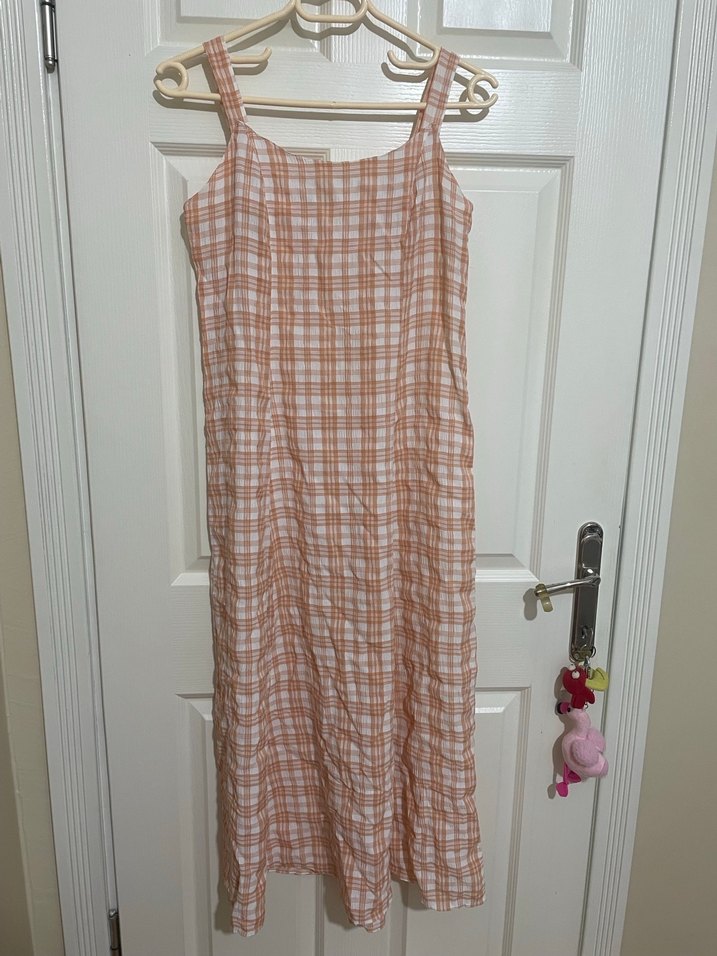 İki renkli, rahat kumaştan uzun elbise. Ekoseli deseni, pile detayları ve kayık yaka ile sade bir şıklık sunar. Rahat kesim ve kolsuz tasarım içerir.