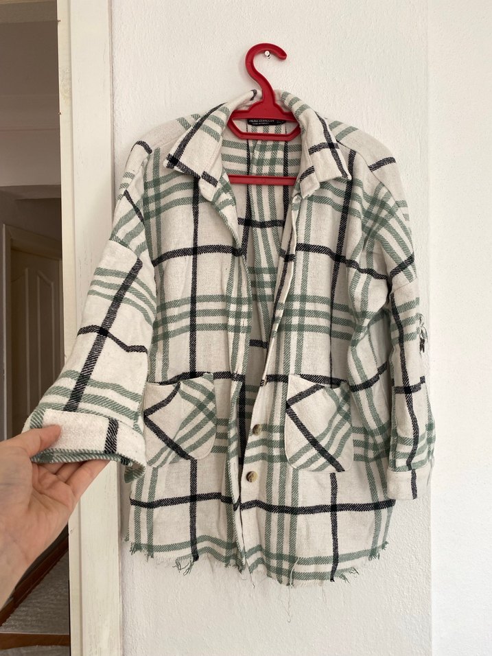 ekoseli, uzun kollu, düğmeli, rahat kesim kadın gömleği. Notlu yakası ve midi boyu ile günlük sokak stiline uygun.