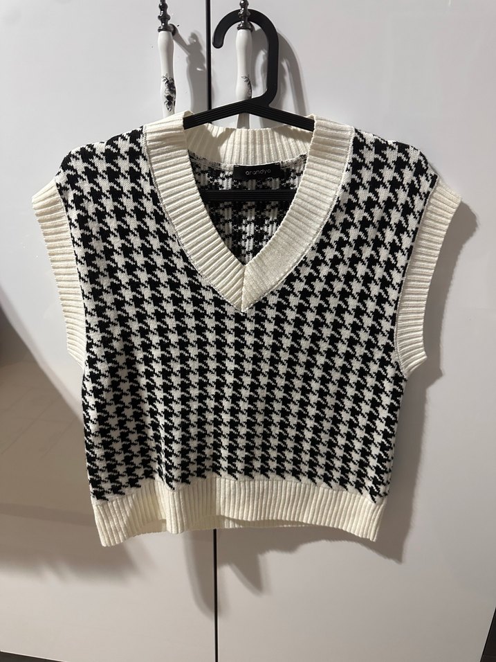 Örgü dokulu, ekoseli, beyaz ve gri renkli, V yakalı, kolsuz, bol kesim midi uzunlukta kadın süveter. Paris tarzı günlük sokak modasına uygun. isteyene özelden video atabilirim