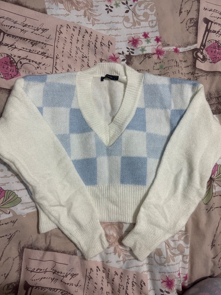 Bu kadın kazağı, beyaz ve açık mavi pastel ekoseli desenli örme dokusuyla dikkat çekiyor. Uzun kollu, V yakalı, bol kesim ve normal boydadır. Rahat ve şık, günlük sokak stili için uygundur.