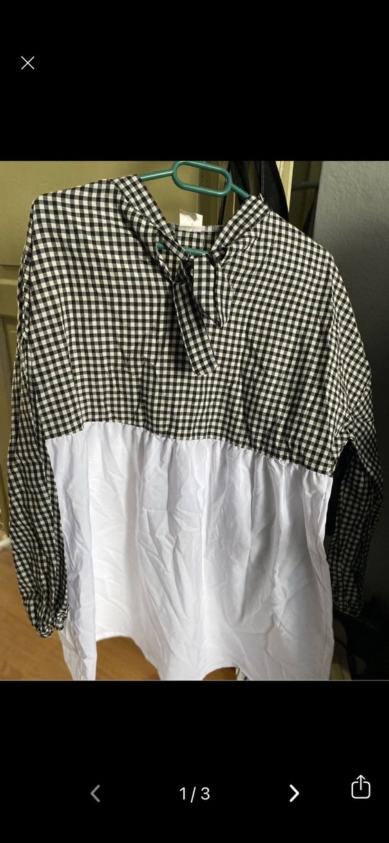Uzun kollu, düğmeli ve yakalı kadın gömleği. Üst kısmı siyah beyaz ekose, alt kısmı düz beyaz pamuklu kumaştan yapılmıştır. Salaş kesimi ve midi boyu ile rahat bir tarz sunar.