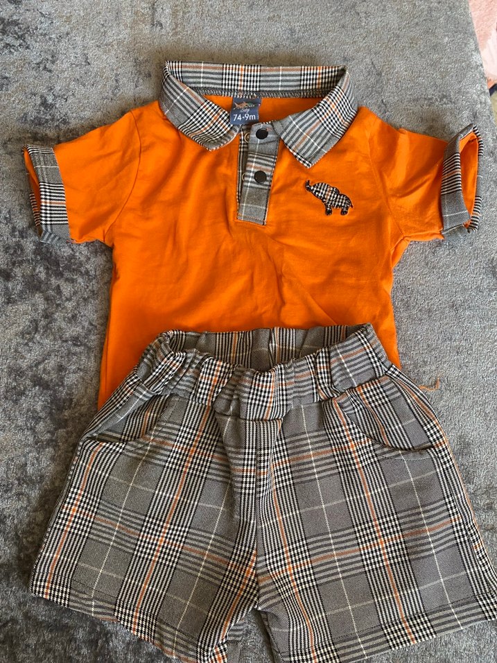 Kısa kollu turuncu tişört, ekoseli yaka ve düğmeli detaylarla. Ekoseli şort ile tamamlanan yumuşak ve rahat kumaşlı bebek takımı.