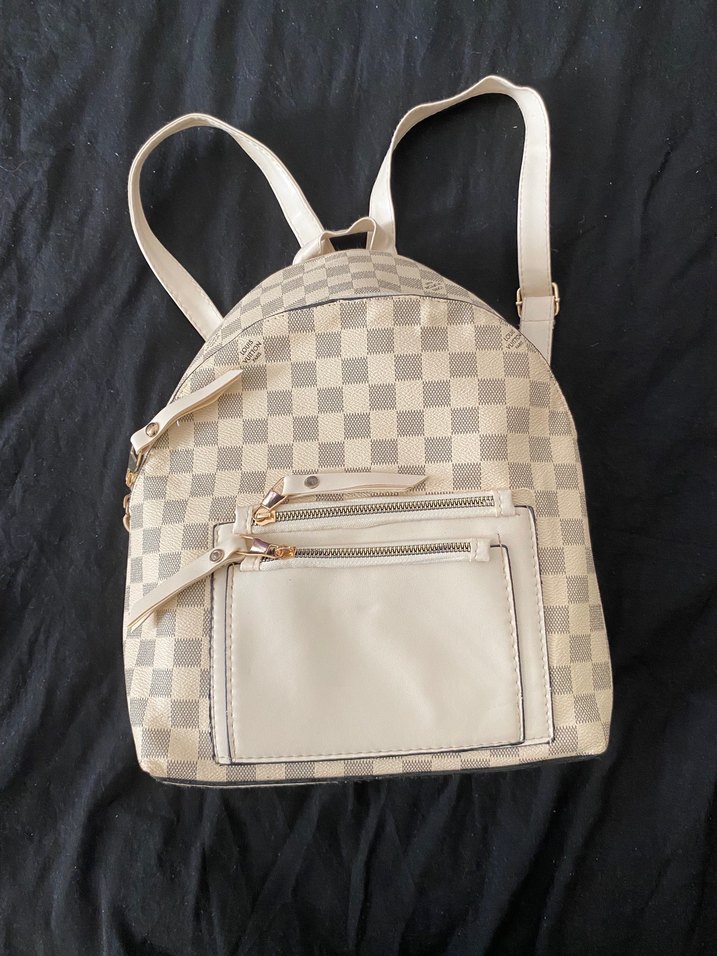 Ekru beyaz deri ve ekose desenli, fermuarlı cepleriyle günlük kullanıma uygun kadın sırt çantası.