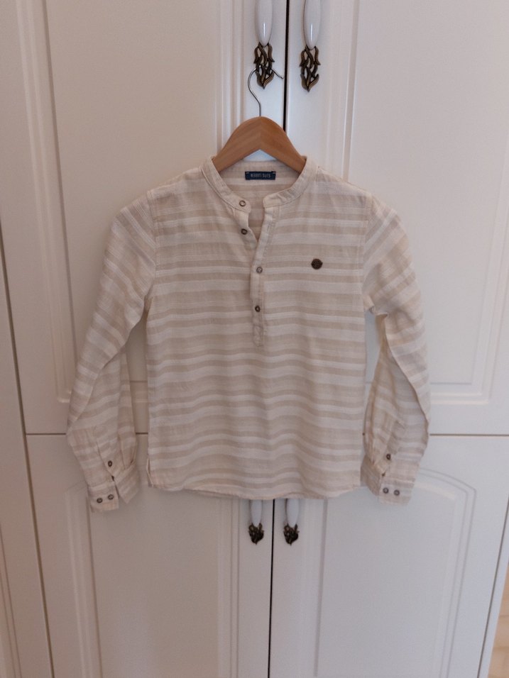 Açık bej çizgili, uzun kollu, yakalı ve düğmeli erkek çocuk keten gömlek. Rahat kesimi ve nefes alan kumaşıyla gündelik sokak stiline uygun. desenli ceket ile takım yapılabilir