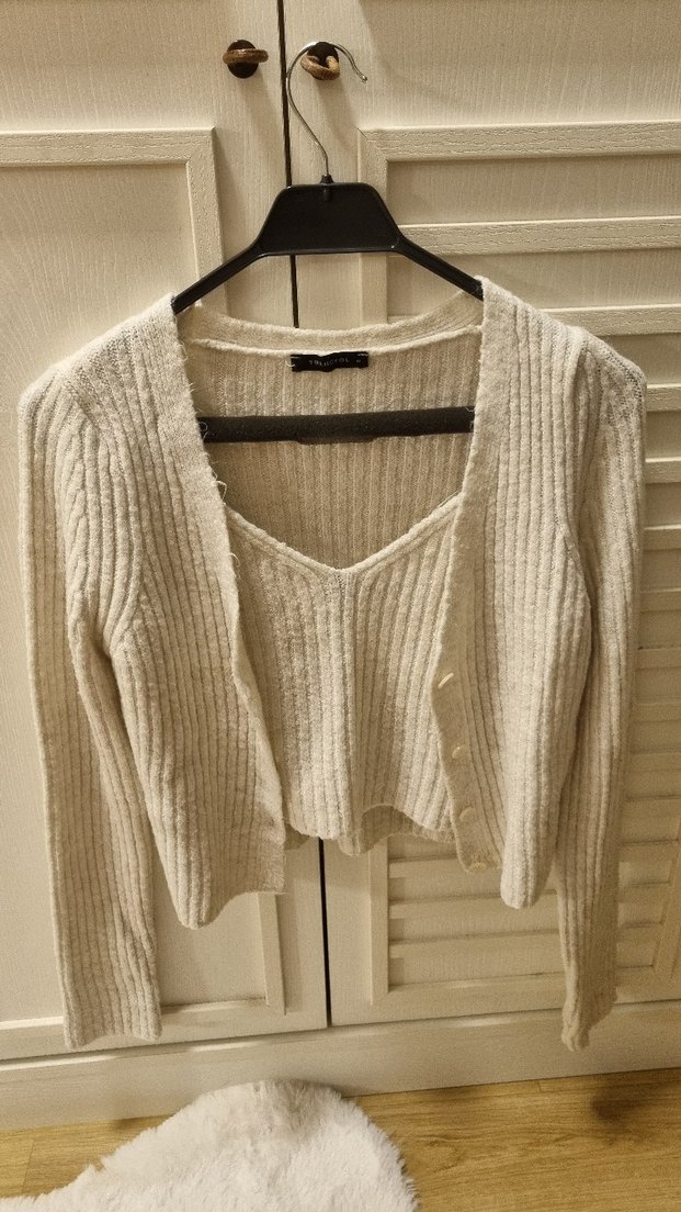 Ekru renkte, v yaka ve uzun kollu, ince triko dokulu bluzlu kısa kesim kadın hırkası, günlük kullanıma uygundur. Ürün Bir kere giyildi