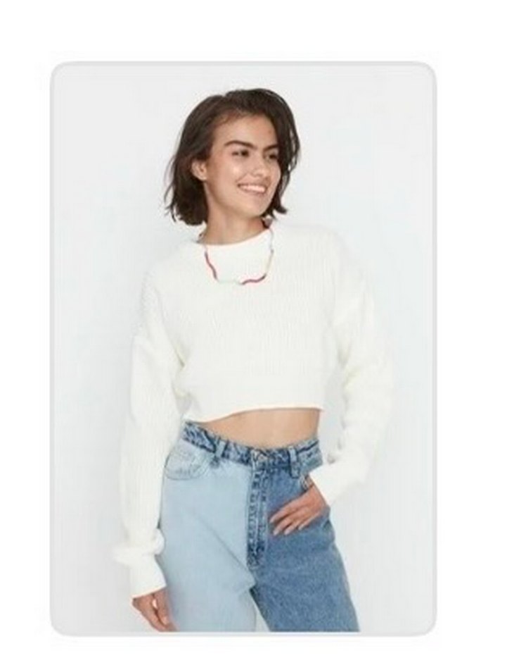 Beyaz triko kumaştan, yuvarlak yakalı ve uzun kollu, salaş kesim crop kadın kazak. Günlük kullanım için rahat ve şık bir parça. 2-3 defa giydim sadece