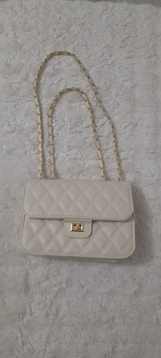 Kürk detaylı, zincir askılı ekru deri kadın çantası, kapitone desende ve modern klasik tarzda. Günlük kullanıma uygun.
