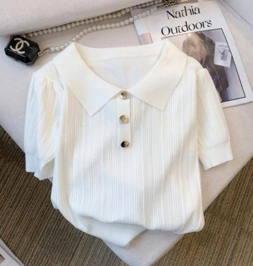 Ekru Düğmeli Beyaz Kısa Kollu Pamuklu Bluz