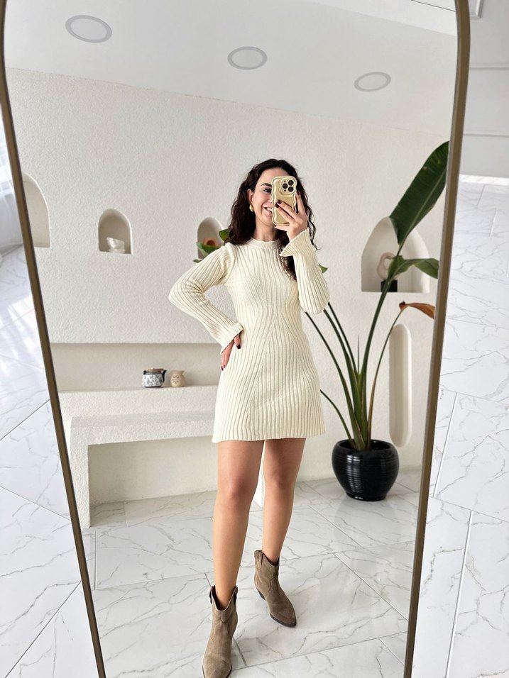 Ekru Fitilli Kumaş Triko Mini Elbise