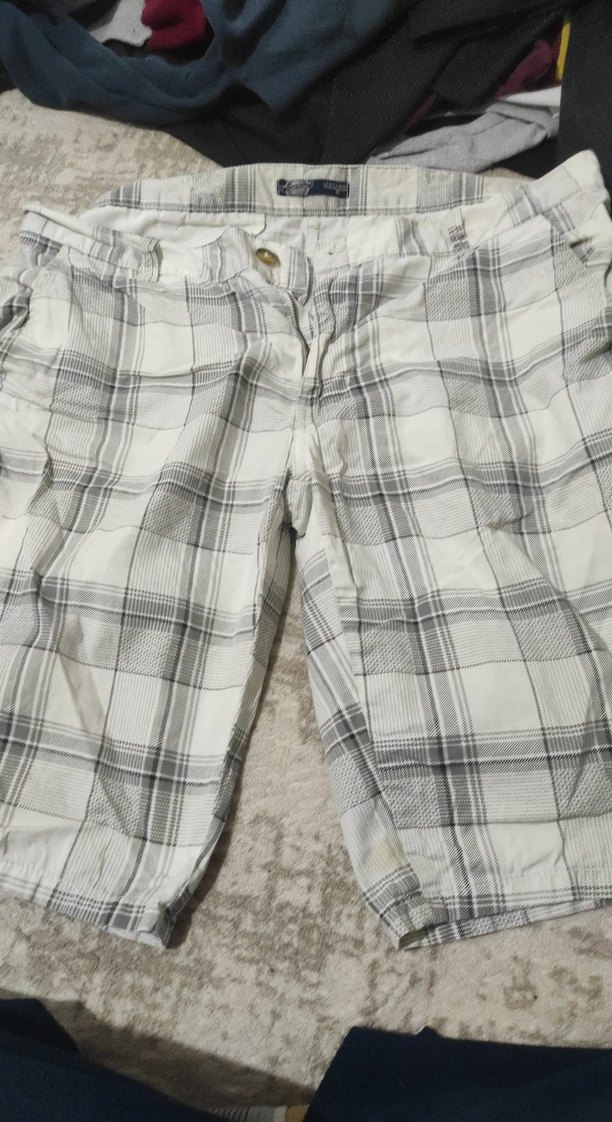 Pamuk kumaştan, düğmeli ve gri ekose desenli, bol kesim erkek şortu. Rahat ve gündelik stil için uygundur.
