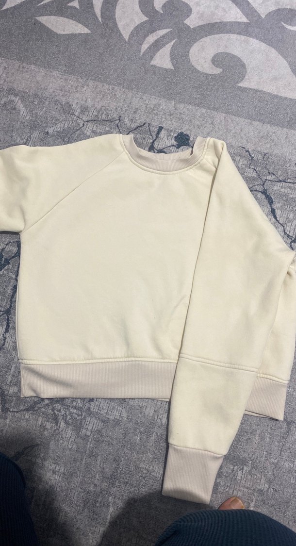 Beyaz renkli, bisiklet yaka ve uzun kollu sweatshirt, yumuşak ve sıcak kumaştan üretilmiştir. Salaş kesim ve desensiz, sade tasarıma sahiptir. Özel dikimdir 2 defa giyildi