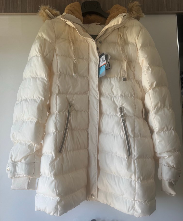 Fabrika marka 38 beden su tutmayan kumaş ekru renkte, kapüşonlu ve yumuşak kürk detaylı kadın kışlık kaban. Uzun kollu, normal midi boyda, rahat ve şık. ❄️