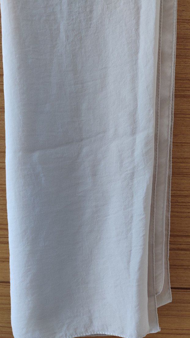 ekru keten kumaştan, drapeli tasarıma sahip kadın şalı, minimalist ve bohem tarzda, yumuşak gri tonlarıyla.