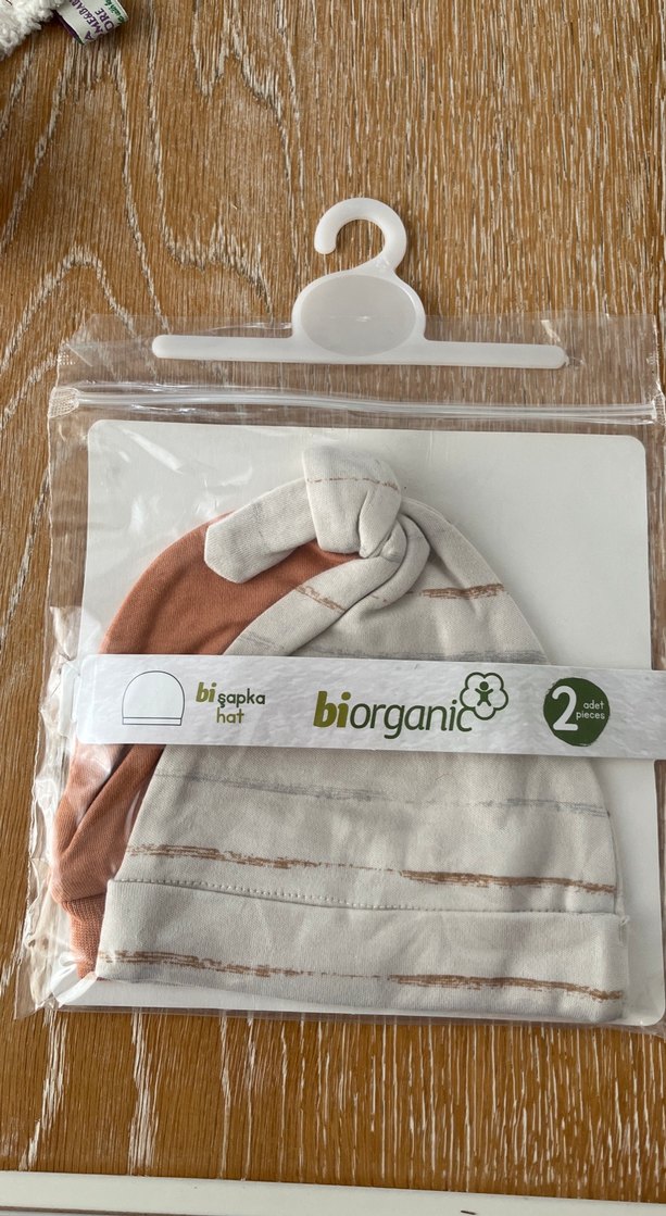 Yumuşak kumaştan üretilmiş, ekru ve kiremit renklerde, desenli 2'li bebek şapka