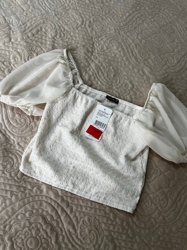 Beyaz, kısa kollu, straplez mini bluz, dokulu gövde ve şeffaf kollara sahip, rahat kesim. Günlük sokak tarzı için uygundur.