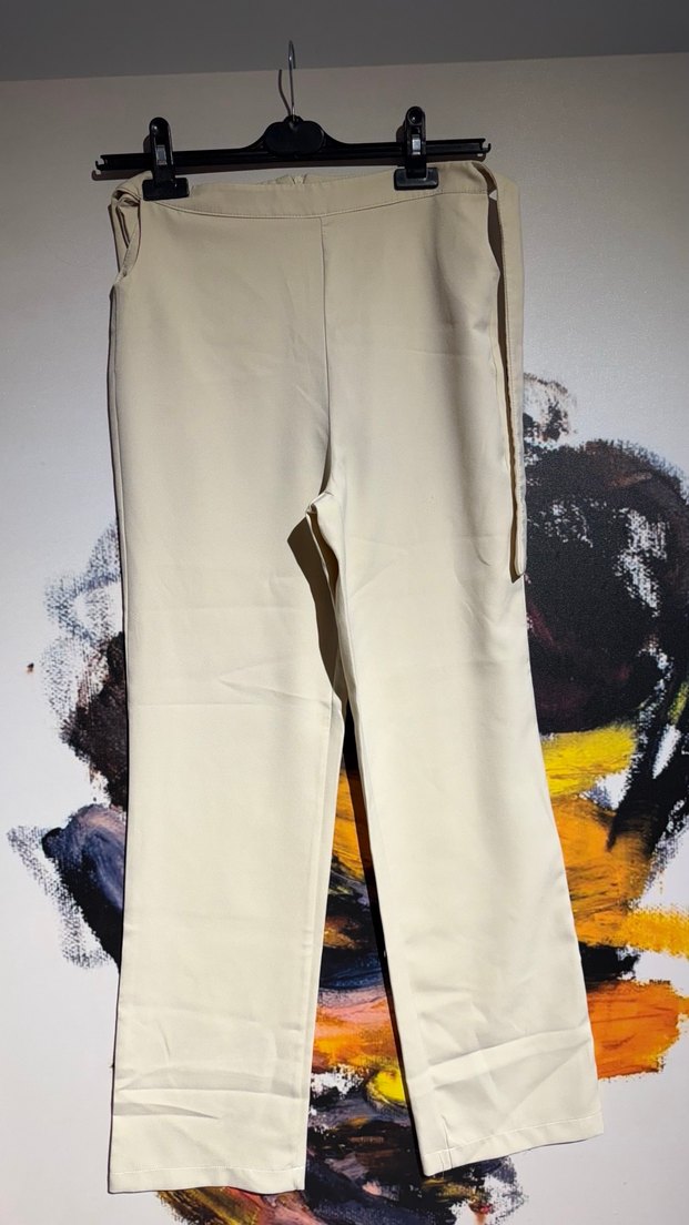 Ekru-Krem midi boy, kemerli kadın kumaş pantolon. Rahat kesimli ve sentetik kumaştan üretilmiştir, ofis için uygundur.