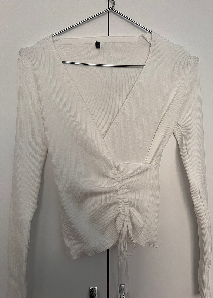 Ekru kruvaze büzgü detaylı triko kazak