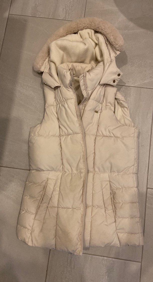 Ekru renkli, kürklü detaylı, yakalı ve kolsuz geç kız yeleği. Yumuşak ve sıcak kumaştan, midi boyda, trend sokak stili için uygundur. 9-10 yaş ama xxs e de olur .