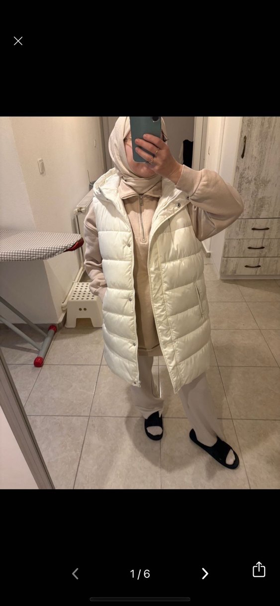 Yüksek yakalı, fitted kesim beyaz midi şişme yelek, yumuşak ve sıcak fleece kumaştan. Kolsuz ve şişme tasarımlı, rahat ve şık günlük kullanım için uygun.