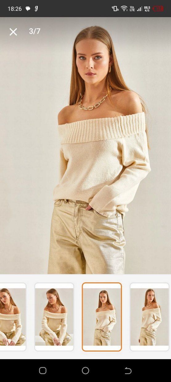 Ekru renkli,Madonna yaka salaş kazak. Etiket mevcut değil fakat hiç giyilmedi üründe hiçbir sorun yok.