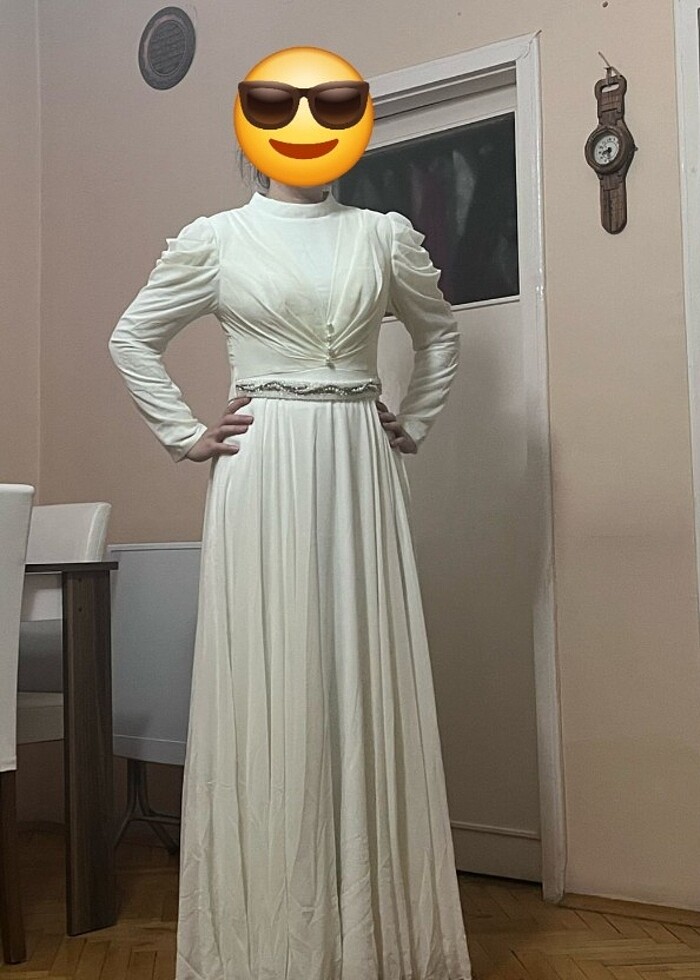 İnci detaylı. Esnek kumaş. 1 defa giyildi. Tertemiz. 40-42 bedene uyumlu. Fotoğraf daki 166cm boyunda 65 kg. Fotoğrafda 12 cm topuklu ayakkabı ile giyildi. Hazır duvak ve incili baş aksesuarı hediye...