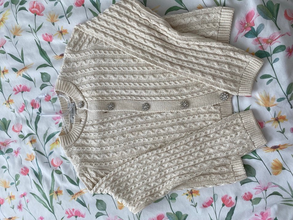 Uzun kollu, yuvarlak yaka, örgü dokulu, ekru renkte, bohem tarzda, günlük kullanıma uygun, vücuda oturan kadın hırkası.