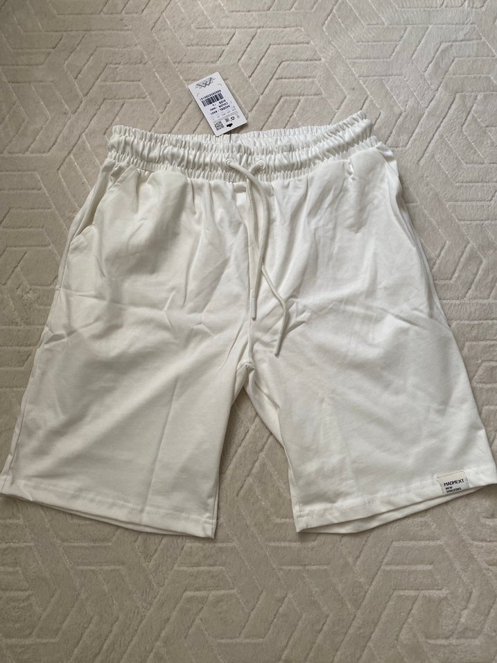 Ekru renkte, pamuklu yumuşak kumaştan yapılmış, rahat kesim erkek şort. Konfor için bağcıklı lastikli bel detayına sahiptir.